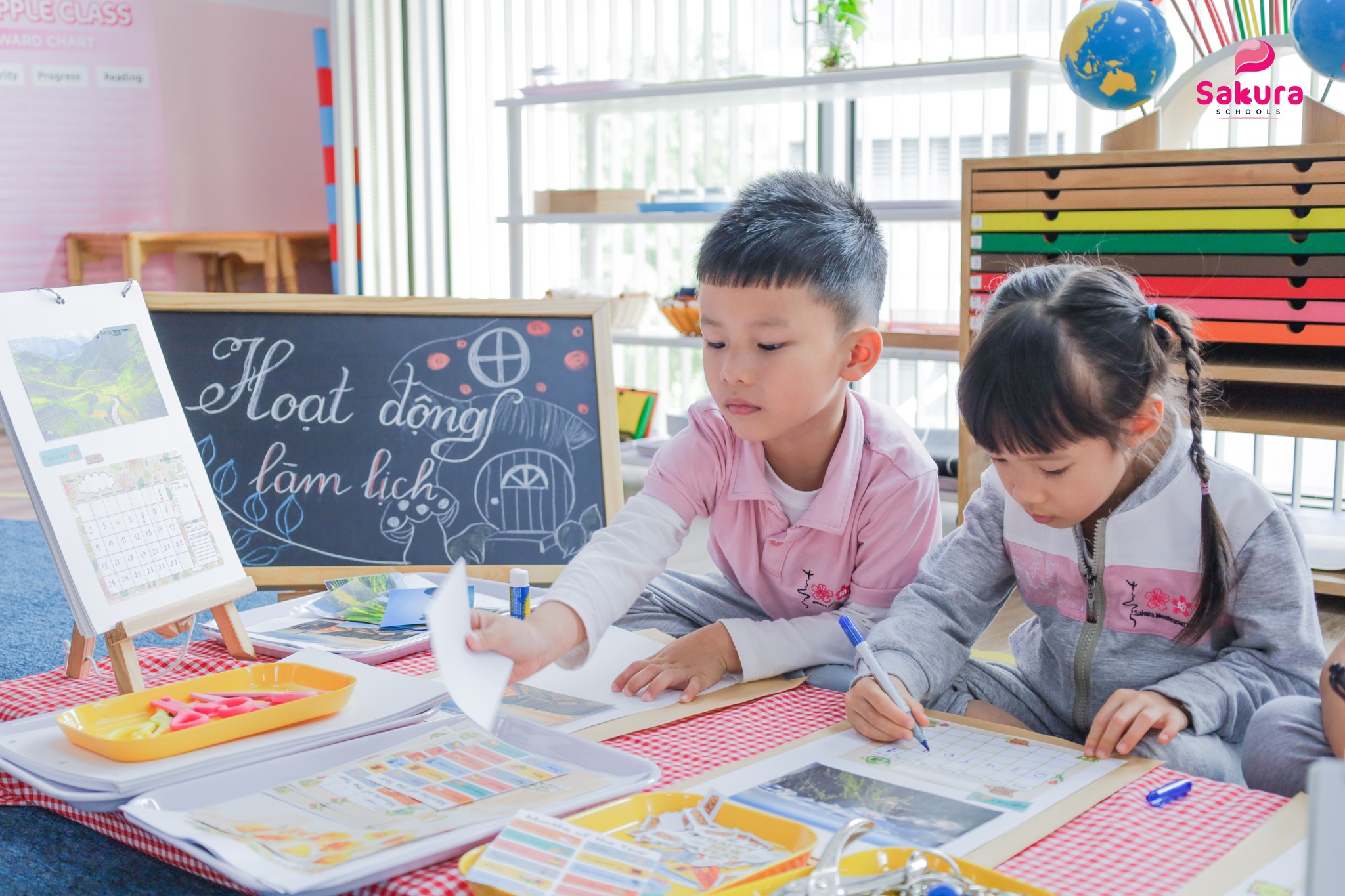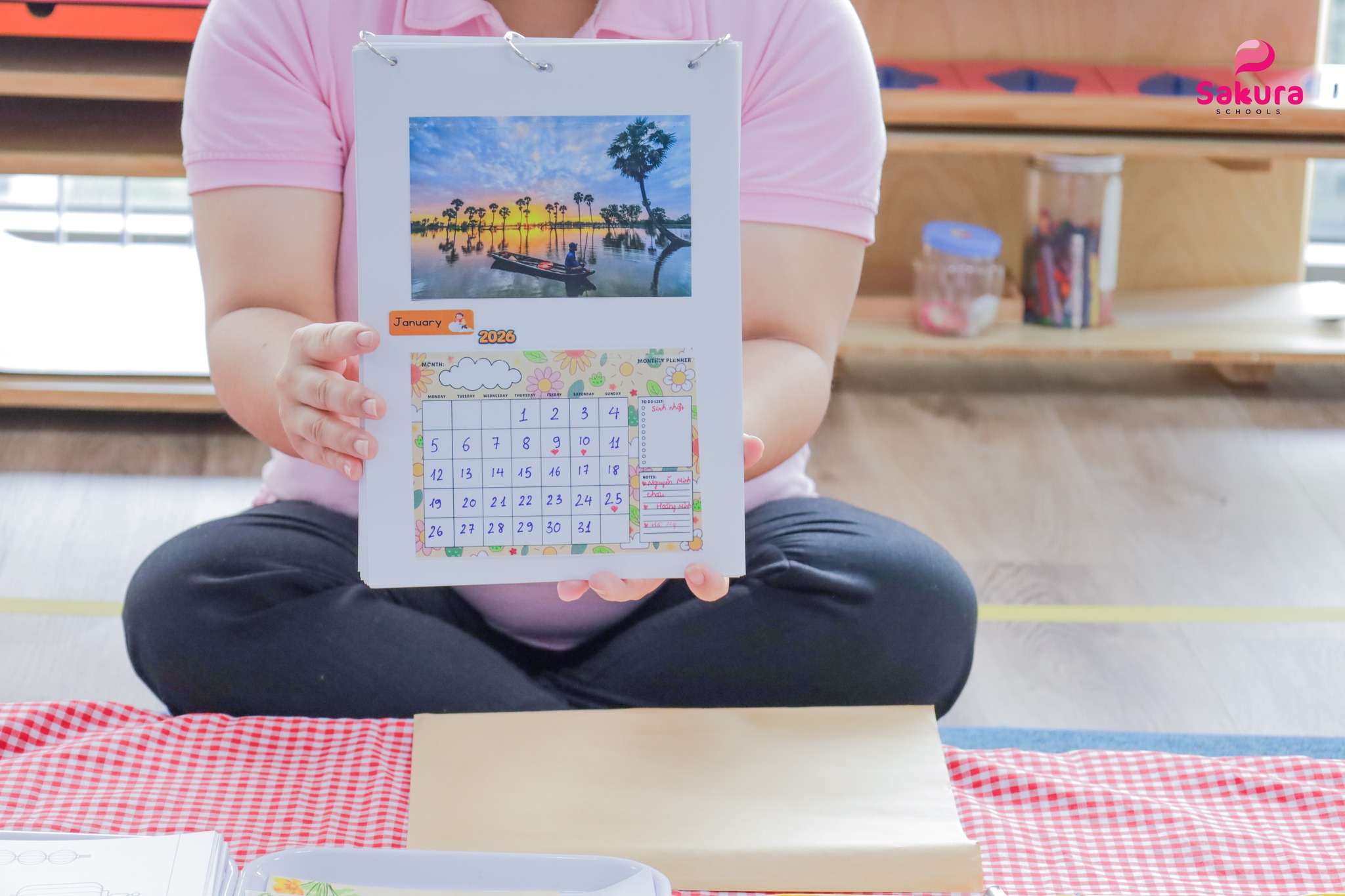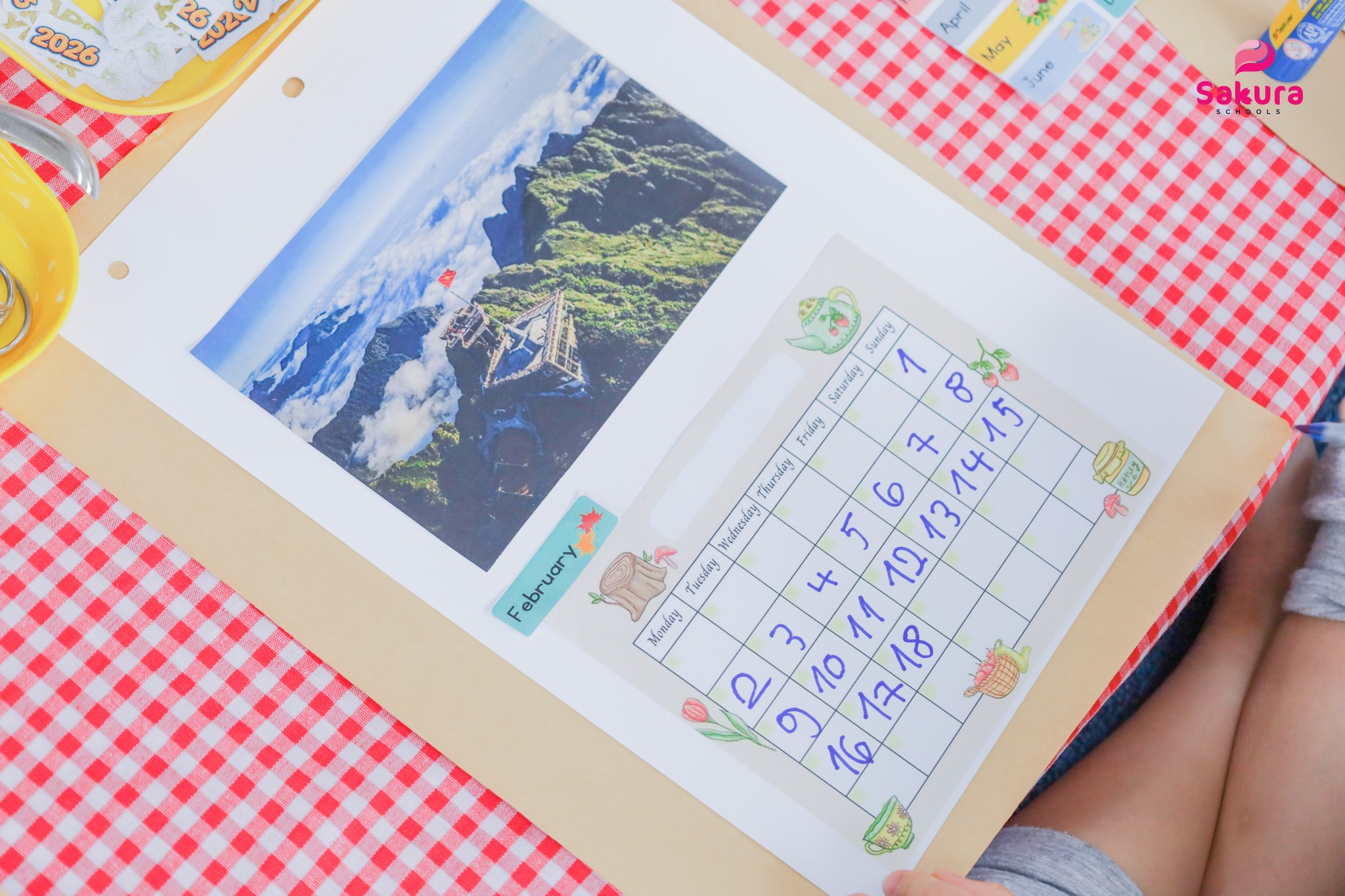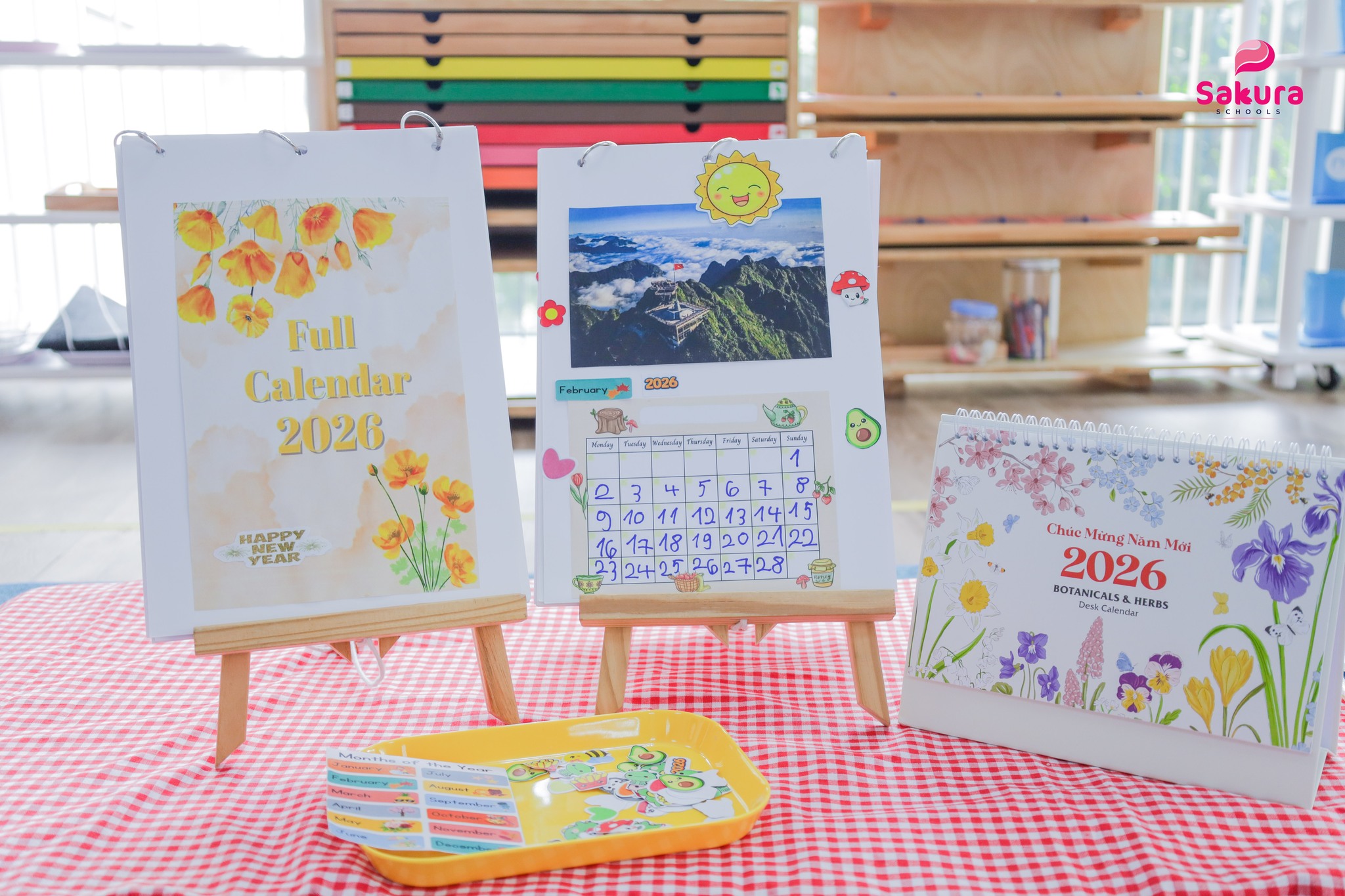 Ở góc địa lý trong lớp học Montessori, hoạt động Làm lịch là bước chạm đầu tiên của trẻ với khái niệm thời gian. Khi tự tay viết ngày, tháng, năm, đếm ô, dán thẻ số, chọn hình ảnh và đánh dấu những ngày đặc biệt, trẻ không chỉ tạo ra cuốn lịch 2026 của riêng mình, mà đang học cách sắp xếp, phân loại và hiểu nhịp chuyển động của thời gian.