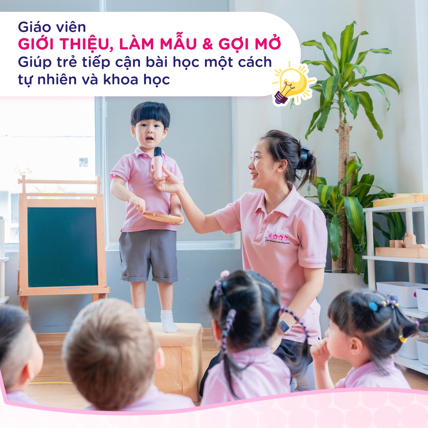 Ví dụ: Ở giai đoạn 4 tuổi, có thể con vẫn thích các hoạt động ở góc Thực hành cuộc sống như rót nước, lau bàn, cài cúc áo… nhưng chính những hoạt động ấy nuôi dưỡng sự tập trung, khéo léo và tính độc lập – nền tảng cho việc học sau này. Các cô luôn tôn trọng nhịp cá tính, sự lựa chọn của mỗi bạn nhỏ để con tự do trải nghiệm theo mong muốn, đồng thời khéo léo gợi mở các kiến thức mới phù hợp, “gieo hạt mầm học thuật” qua những liên kết tự nhiên nhất: