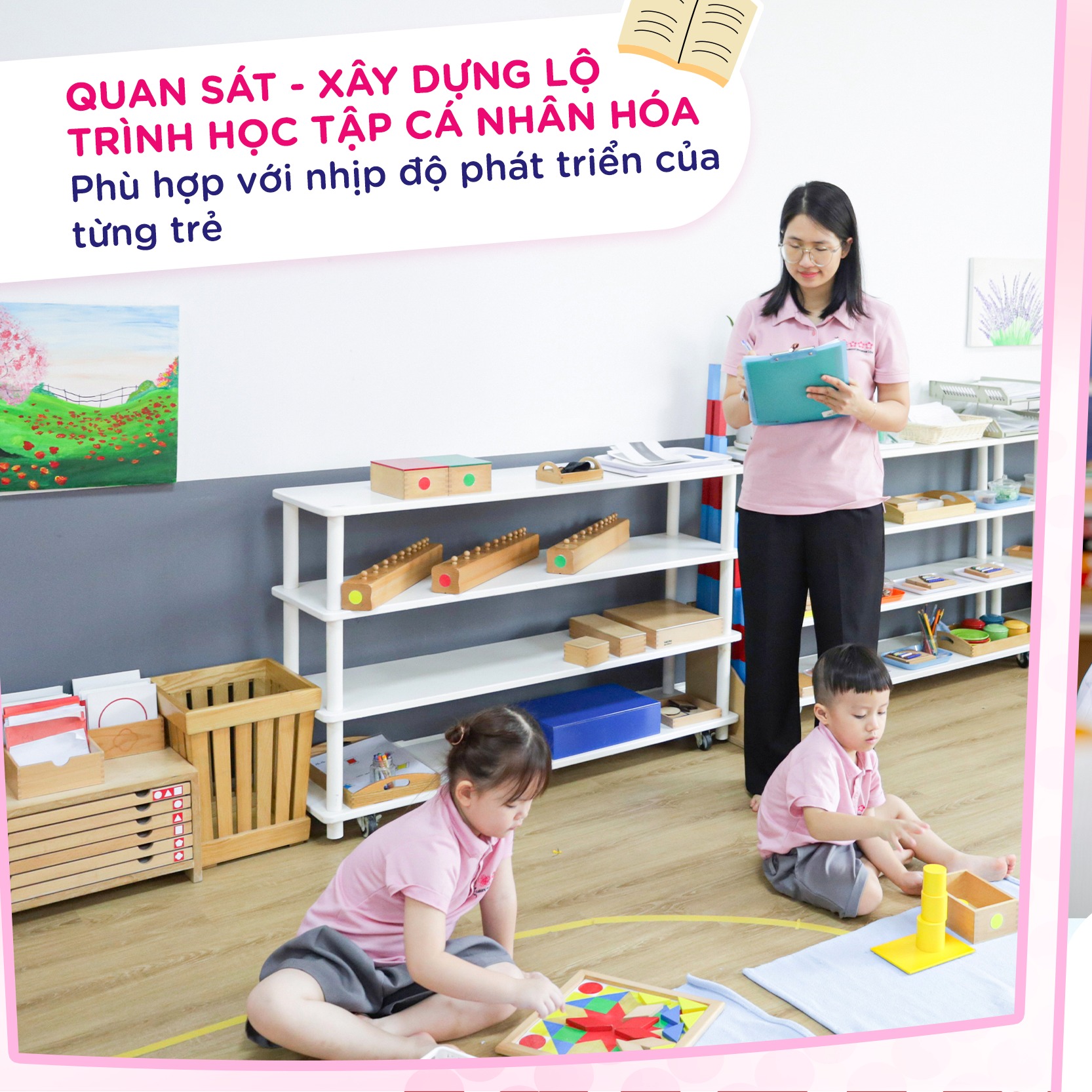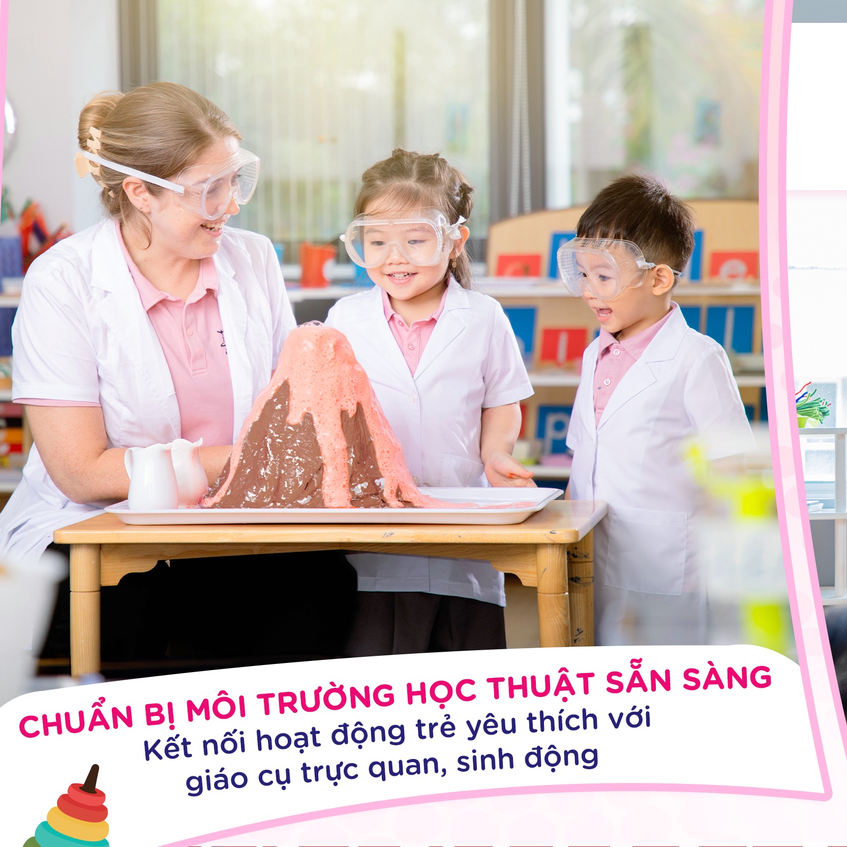 Ví dụ: Ở giai đoạn 4 tuổi, có thể con vẫn thích các hoạt động ở góc Thực hành cuộc sống như rót nước, lau bàn, cài cúc áo… nhưng chính những hoạt động ấy nuôi dưỡng sự tập trung, khéo léo và tính độc lập – nền tảng cho việc học sau này. Các cô luôn tôn trọng nhịp cá tính, sự lựa chọn của mỗi bạn nhỏ để con tự do trải nghiệm theo mong muốn, đồng thời khéo léo gợi mở các kiến thức mới phù hợp, “gieo hạt mầm học thuật” qua những liên kết tự nhiên nhất: