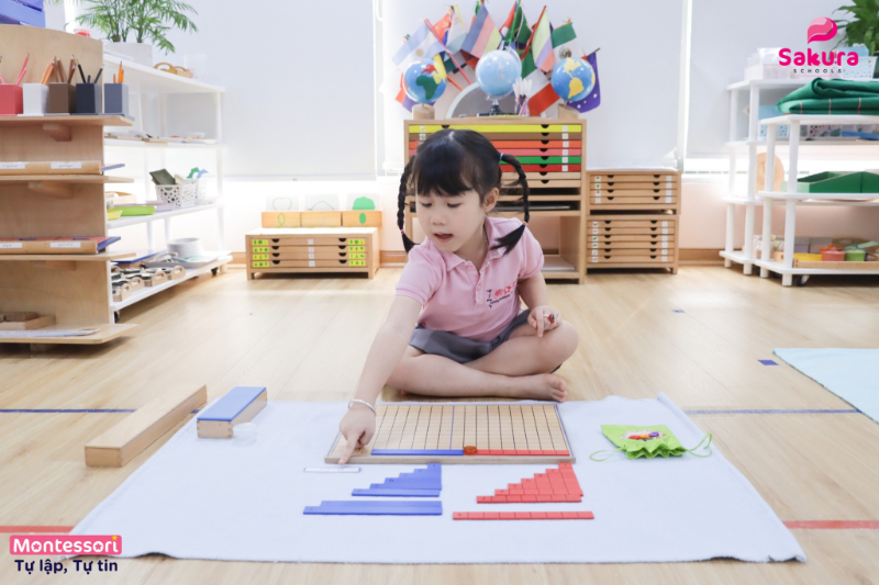 Trong lớp học Montessori, trẻ từ 4 đến 6 tuổi không học toán qua con số khô khan hay ghi nhớ công thức, mà trải nghiệm trực tiếp các khái niệm trừu tượng thông qua giáo cụ cụ thể và hấp dẫn. Ở lứa tuổi này, trẻ đã có thể làm việc với hệ thập phân, thực hiện các phép tính cộng, trừ, nhân, chia với những số lên đến hàng nghìn, và thậm chí làm quen với phân số thông qua các bộ giáo cụ trực quan, sinh động. Do được tiếp cận toán học thông qua trải nghiệm thú vị và trực quan, trẻ thường đạt được các kiến thức toán học nâng cao sớm hơn. Ví dụ: Trẻ 4,5 đến 5 tuổi có thể thực hiện phép cộng 4 chữ số có nhớ, làm phép nhân, phép trừ, phép chia,…hiểu bản chất hệ thập phân, phân số thông qua các hoạt động với giáo cụ trực quan.