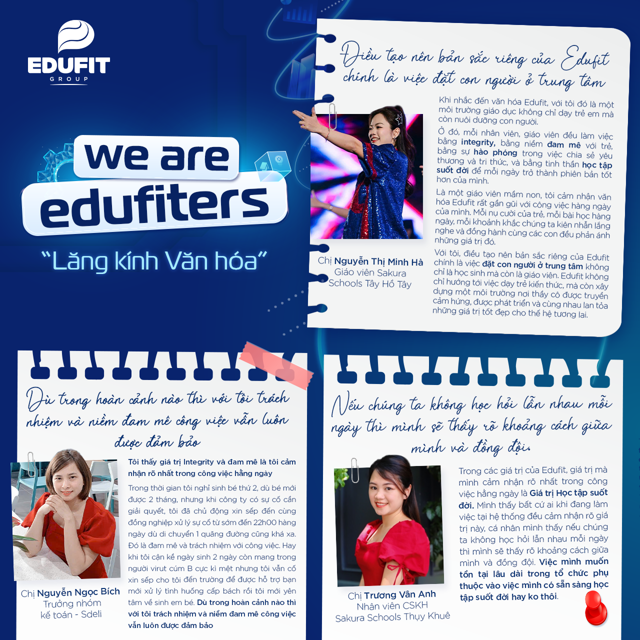 Làm đúng, dù không ai kiểm tra. Đi thêm một bước, vì mình thật sự quan tâm. Sẵn sàng chia sẻ, thay vì giữ lại. Không ngừng học tập, ngay cả khi đã “biết rồi”. Integrity, Đam mê, Hào phóng và Học tập suốt đời đi vào trong cả công việc và đời sống của mỗi Edufiter theo cách như thế.